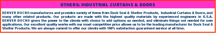DENVER DOCK¡¯s Industrial Curtains and Doors have been proven with the highest quality. All made in U.S.A. Facility serving nationwide and worldwide. Our specialized engineers have been trained for several years of making the highest top quality Industrial Curtains and Doors using specialized sewing machines.