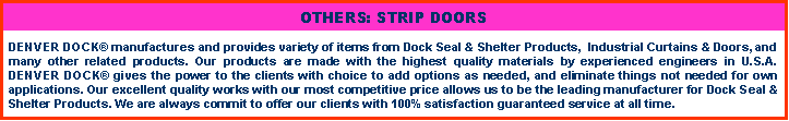 DENVER DOCK¡¯s Industrial Strip Curtains & Doors have been proven with the highest quality. We provide our products and services to nationwide and worldwide. Our specialized engineers have been trained for several years of making the highest top quality Industrial Strip Curtains & Doors using specialized machines.