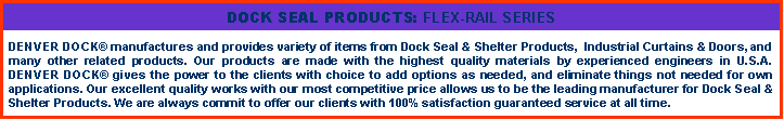 DENVER DOCK¡¯s Dock Seals & Dock Shelters have been proven with the highest quality. All made in U.S.A. Facility serving nationwide and worldwide. Our specialized engineers have been trained for several years of making the highest top quality dock seals and dock shelters.