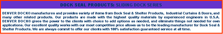 DENVER DOCK¡¯s Dock Seals & Dock Shelters have been proven with the highest quality. All made in U.S.A. Facility serving nationwide and worldwide. Our specialized engineers have been trained for several years of making the highest top quality dock seals and dock shelters.